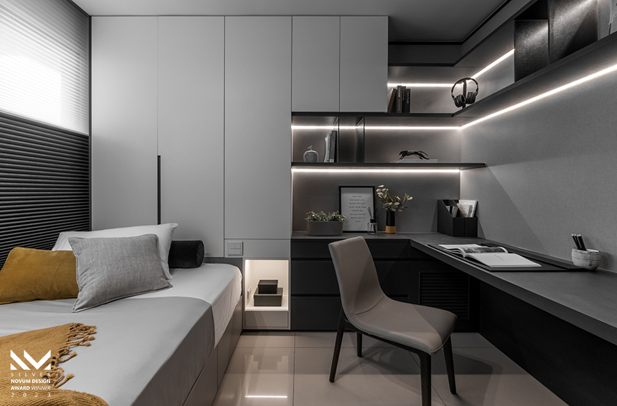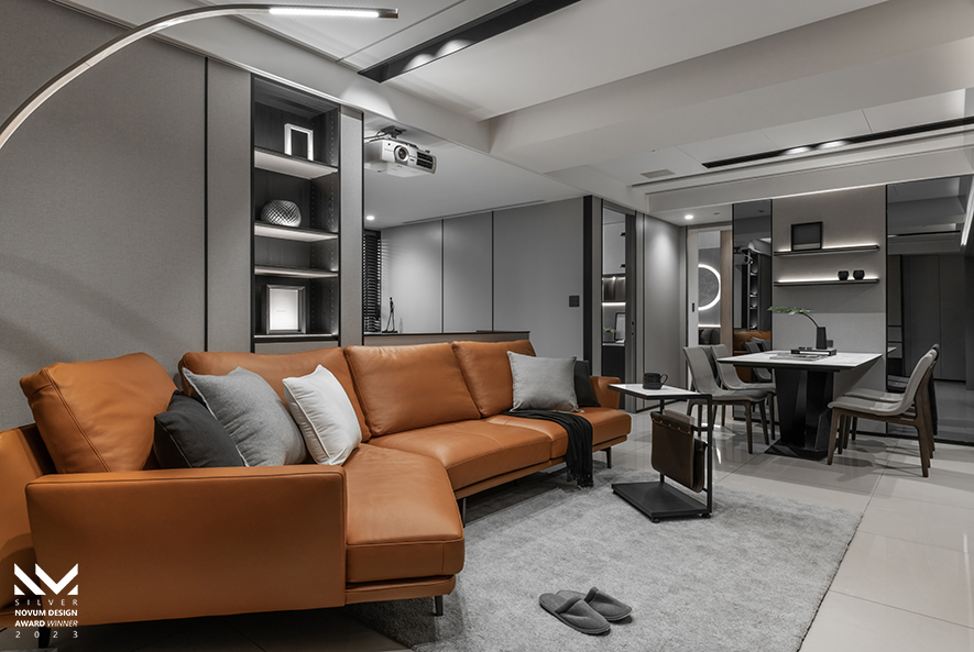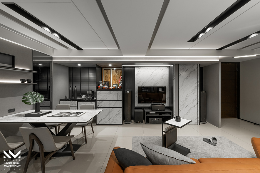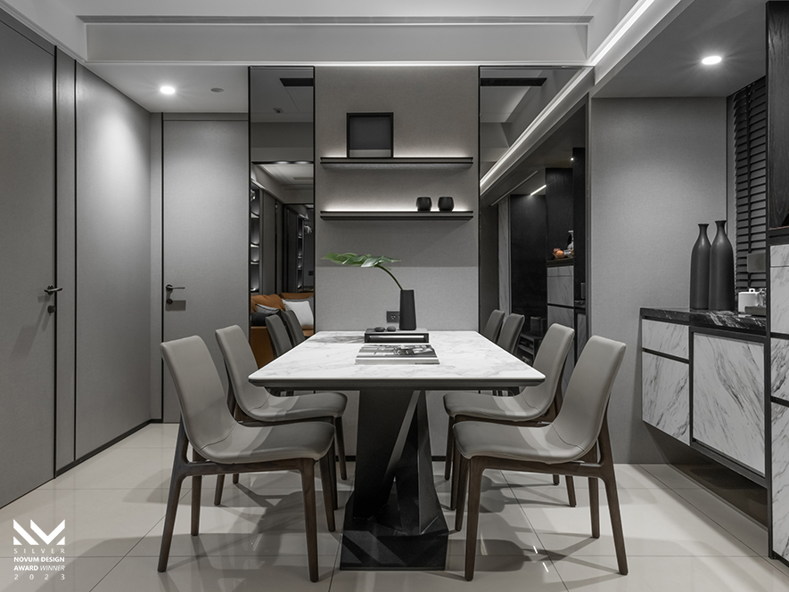 思及屋主一家與四位毛孩相伴,實創設計 賴姿伊 設計總監 選用易保養的耐磨建材構築場域,給予犬隻們自在玩耍的寬敞環境,並搭配灰色調的石紋美耐板,令黑白灰三色與紋理交融,揮灑現代雅景的水墨畫卷《雲潤星暉》擄獲本屆賽事評審團目光,奪得銀獎殊榮!