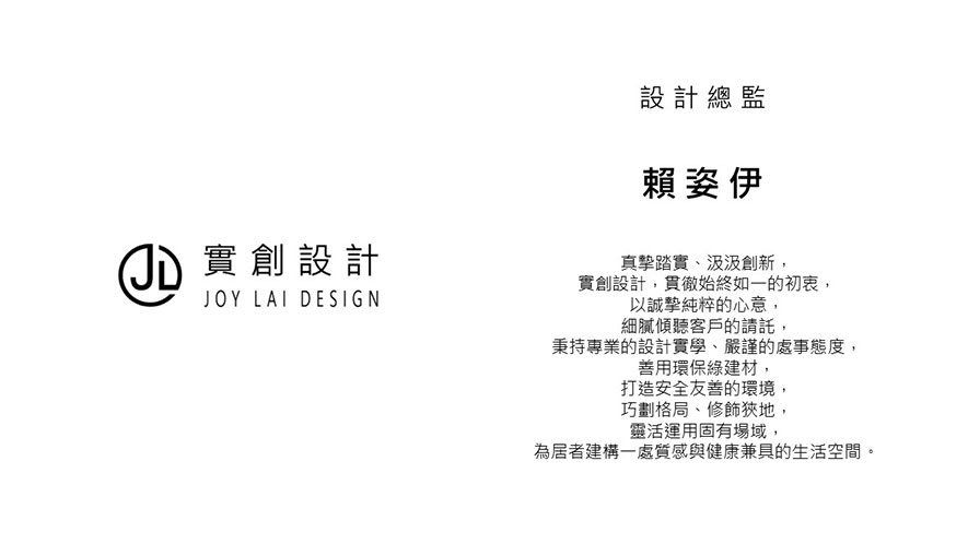 「透過『實在』價值和客戶溝通,激盪出的『創意』火花,正是我們實創設計實現理想空間的方式。」實創設計 設計總監 賴姿伊 重視與人之間的溝通過程,藉由交流期間的細心觀察,逐步雕琢專屬客戶的獨特風格,最終淬鍊出對方夢寐以求的精美場域。相信日後,賴總監能堅持「以人為本」的誠摯理念,持續揮灑一件件感動人心的創作!