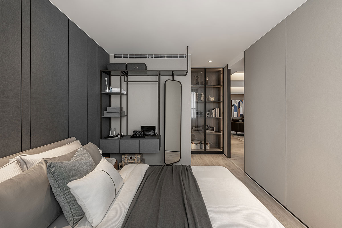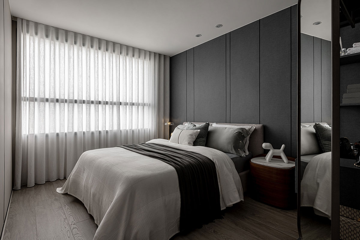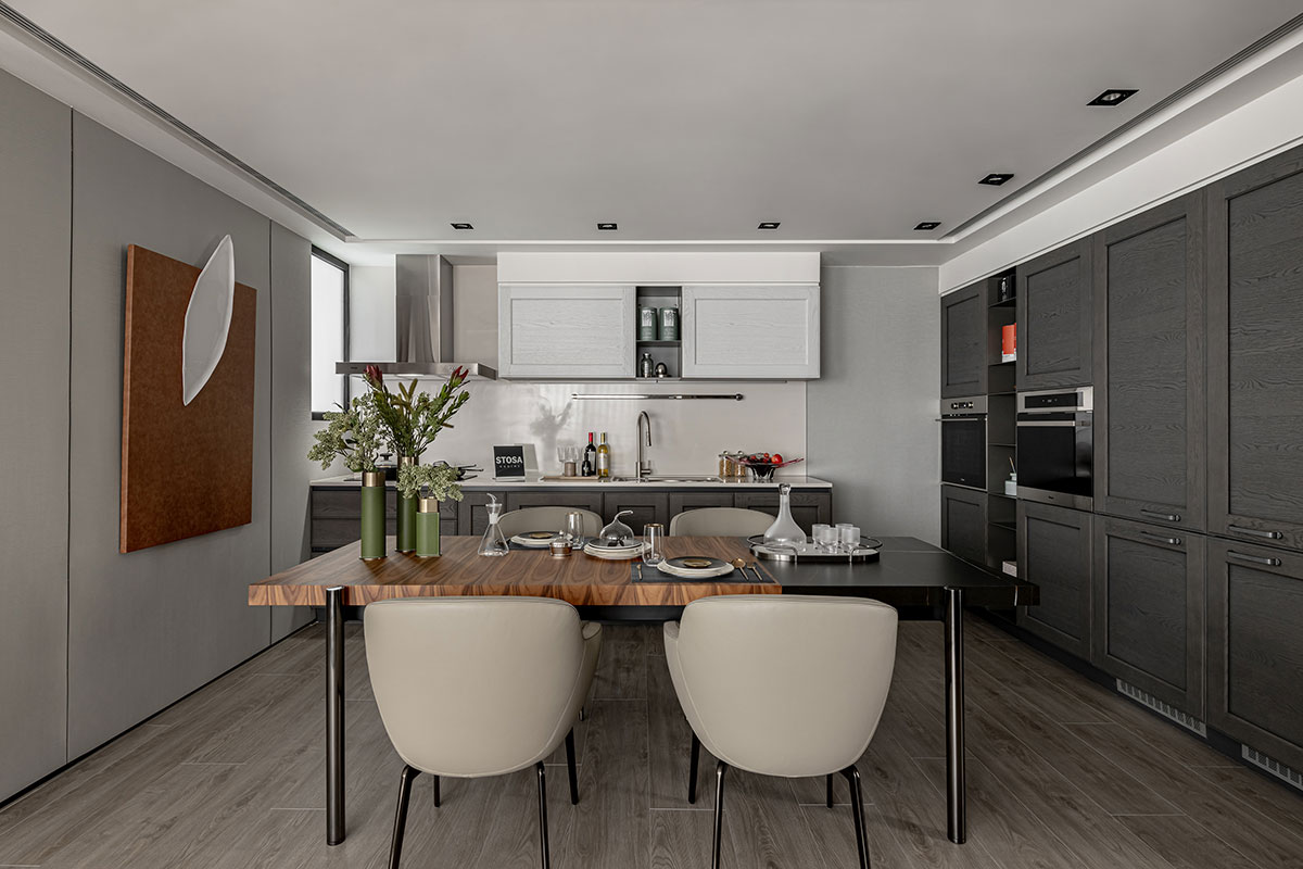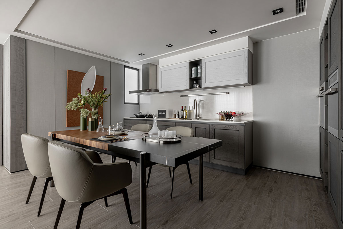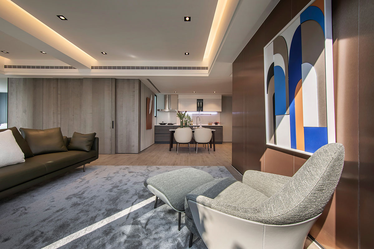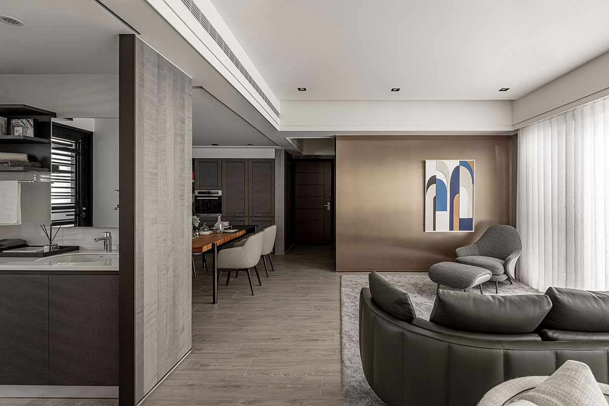 This design artfully balances contrasting preferences to contemplate the refined lifestyle of a couple of financial executives. The male owner values a serene, understated space ideal for hosting guests; the female owner treasures a bright, welcoming ambiance for intimate afternoon gatherings and expresses her passion for cultivating flora. The layout incorporates two distinct living rooms to accommodate these dual desires, each meticulously crafted to reflect their unique tastes, creating harmonious sanctuaries of sophistication. The design journey encountered challenges presented by structural beams that fragmented the spatial flow. These obstacles were skillfully addressed through a layered ceiling design that not only resolves the architectural constraints but also enhances the overall visual rhythm. By eschewing excessive partitions, the plan fosters an open and fluid connection between the living and dining areas, cultivating an atmosphere of spatial continuity and balance. Further elevating the design, the expansive balcony was thoughtfully reimagined to honor the female owner’s love for gardening. This outdoor extension introduces lush greenery into the interior, blurring the boundaries between indoor and outdoor spaces. The result is a tranquil and invigorated narrative, where natural elements imbue the home with vitality and serene elegance.