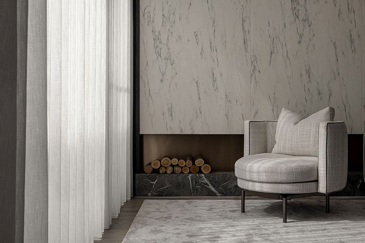 Golden sunlight filters gently through expansive French windows, caressing the metallic-textured high-pressure laminates with a luminous sheen. This interplay of light dances harmoniously with the white stone-patterned walls, weaving a tranquil narrative that flows effortlessly throughout the interior. By the fireplace, a plush armchair offers a warm embrace, poised to host the female owner as she cherishes serene moments with close companions. In the front living room, a state deep-gray leather armchair exudes understated elegance, providing the perfect setting for the gentleman to savor his tea in quiet refinement. The transparent display cabinets play as curators of cherished memories, showcasing artifacts and keepsakes from journeys across the globe, delicately recounting the family’s shared adventures. From the open kitchen wafts an inviting aroma, a silent call that draws the children home. Here, amidst the comforting warmth of the hearth, heartfelt conversations and joyous reunions unfold, encapsulating the essence of familial bonds within a beautifully orchestrated space.